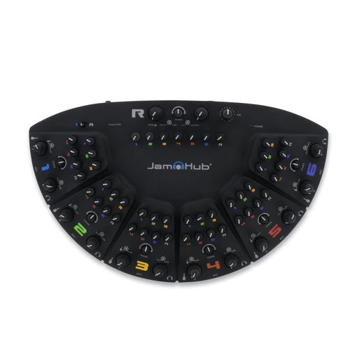 JamHub’s GreenRoom studio expands on the BedRoom’s legendary utility with two more sections, phantom power, and a direct USB line out for recording. Each player plugs in their instrument, their microphone, and their headphones, then use the intuitive SoleMix interface to customize their own personal mix. Free to turn themselves up, their bandmates down, and get lost in the music.