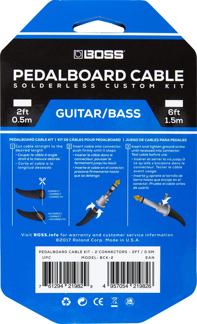 The BOSS Solderless Pedalboard Cable Kit is designed to save space on your pedalboard without sacrificing tone. Easy to assemble, this customizable system requires only the tightening of a single ground screw on each connector, with no cable stripping required. Our compact bi-directional connectors are engineered to allow straight or right-angle connections, and enable you to place your pedals as close as 1 cm apart.