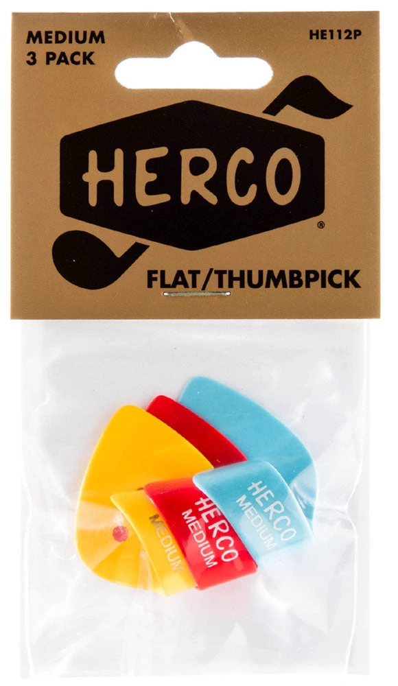 Jim Dunlop Herco Flat Thumb Picks give you a combination of a traditional flat pick and a thumb pick loop. Dunlop has taken the advantages of each style and combined them into one design. When you want to switch between flat picking and traditional thumb picking in the same song, Dunlop thumb picks really come through as the perfect cross between the two different types of picks. Expand your playing ability with this flat thumb pick and show your ability to use different picking techniques.