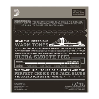 D’Addario Chromes Flatwound Electric Guitar strings are the choice of discerning players for their smooth feel and warm, mellow tone. The strings are wound with flattened “ribbon” wire, then polished to an incredibly smooth surface. Great for classic jazz tone and rockabily twang!