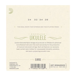 D’Addario EJ65S is an all-nylon set designed for use with soprano ukuleles. Each string is manufactured on D’Addario’s own advanced monofilament extrusion line built exclusively for the production of musical instrument strings. This set is optimized for usage with traditional ADF#B tuning.