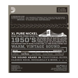 D’Addario XL Pure Nickel strings look back to the ’50s, when nickel was the primary alloy found in electric guitar strings. Into the ’60s, these pure nickel strings would be supplanted when guitarists required brighter tone and enhanced magnetic properties/characteristic of the D’Addario XL nickelplated steel string line, Pure Nickel delivers classic, warmer timbres that define many genres including blues, classic rock, rockabilly, and more.