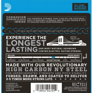 D’Addario EXPs deliver the most natural-sounding, longest-lasting coated strings available. Through our advanced EXP Coated Technology, we have perfected the art and science of coated string-making to deliver extended play strings that sound identical to our world famous XLs. Plus, we’ve dramatically improved the corrosion resistance, longevity and durability of plain steel strings through an exclusive compound tin-plating process. Finally…coated electric strings that deliver longer life, completely natural tone and the feel of uncoated strings. You won’t believe they are coated!