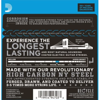D’Addario EXPs deliver the most natural-sounding, longest-lasting coated strings available. Through our advanced EXP Coated Technology, we have perfected the art and science of coated string-making to deliver extended play strings that sound identical to our world famous XLs. Plus, we’ve dramatically improved the corrosion resistance, longevity and durability of plain steel strings through an exclusive compound tin-plating process. Finally…coated electric strings that deliver longer life, completely natural tone and the feel of uncoated strings. You won’t believe they are coated!