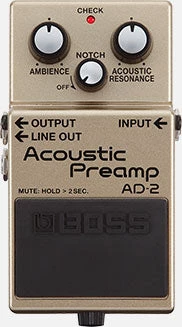 With the AD-2 Acoustic Preamp, acoustic-electric guitarists can now experience natural, studio-quality sound while performing on any stage. Equipped with an advanced BOSS sound engine, this compact pedal packs sophisticated processing power that belies its small size and simple, intuitive interface. Acoustic Resonance reproduces the complex resonance characteristics of your unplugged tone, while Ambience provides pro-level reverberation perfectly optimized for acoustic guitar. The AD-2 also features essential stage tools such as a notch filter for feedback control, a balanced DI out for direct connection to a PA, and a convenient mute function for tuning and switching guitars.