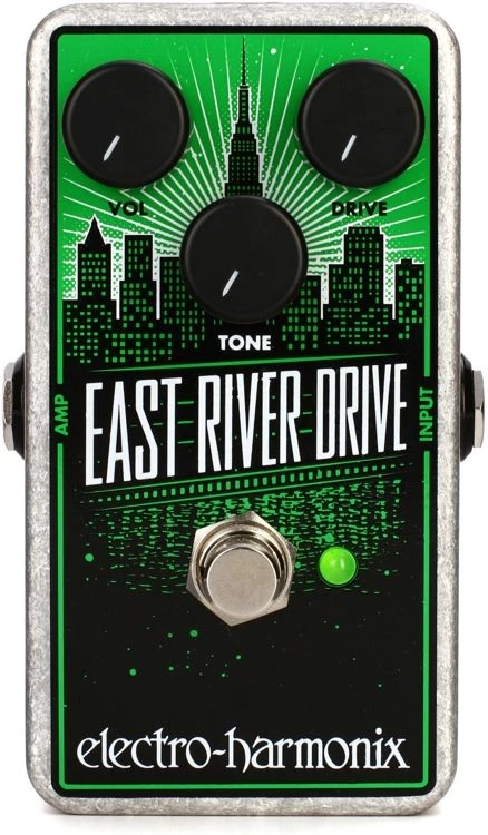 The EHX East River Drive is a JRC4558 IC based pedal thatโs as bold as New York City. Symmetrical overdrive adds edge and gain without compromising tone. Volume and Drive take it from sweet to searing while Tone lets you dial in just the right amount of bite to cut through the mix. No matter how hard you drive it, youโre always in control. True bypass and tone that is absolutely unflinching at a musician-friendly price!