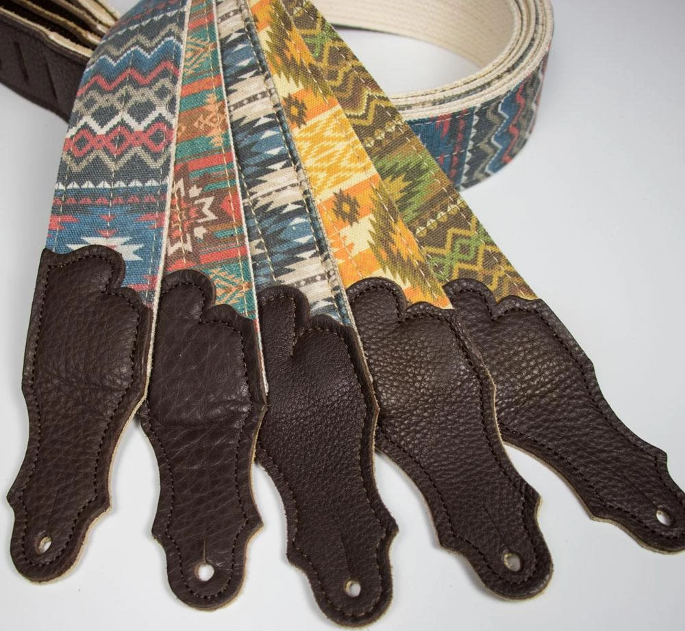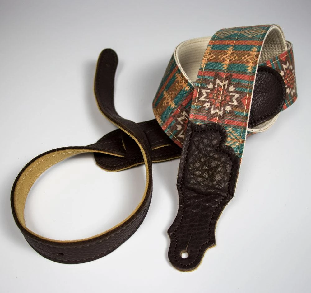 Our Cotton Deluxe βOld Aztecβ series features a softly distressed cotton graphic fabric backed with natural 2β cotton webbing. It is beautifully finished with chocolate glove leather end tabs.