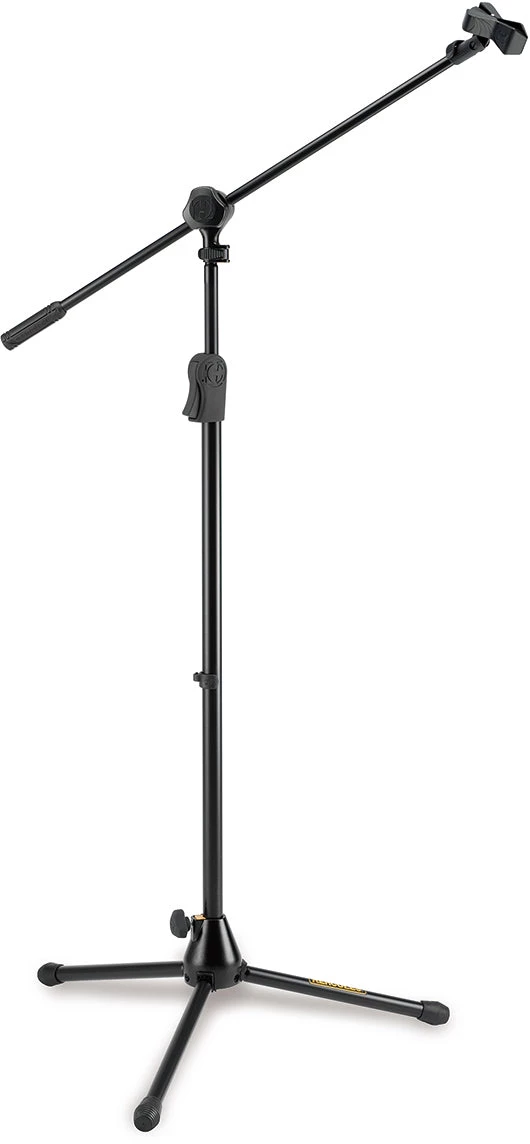 The HERCULES Tripod Base Boom Mic stand MS532B features the EZ Mic Clip, the 2-in-1 Boom Clamp, and the EZ Clutch.