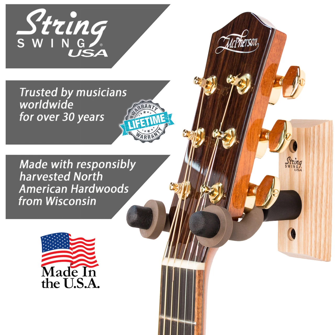 The original String Swing guitar wall mount. The CC01 guitar hanger has the same original design, created by the founder of String Swing back in 1983. This guitar holder remains one of the best selling String Swing guitar mounts to date. As the best option for classical guitars, this guitar hook features a pivoting yoke to securely cradle the guitar’s headstock. It also allows adequate space between the guitar and the wall for acoustics and electrics. Each guitar wall hanger is built of steel and hand welded for quality assurance. The wood blocks that the guitar holders are attached to are made of authentic North American hardwood that is handcrafted by local Amish.