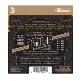 Pro-Arte strings are our the world’s best selling and D’Addario’s premium classical guitar strings. All Pro-Arte treble strings are sorted by a sophisticated computer-controlled laser machine which performs diameter/tension measurements and quality checks, insuring true sounding, precise trebles in every set. J47 basses are wound using 80/20 Bronze on a multi-filament nylon core for slightly brighter tone.