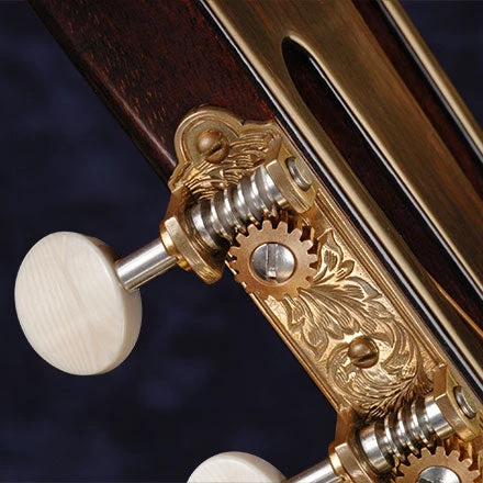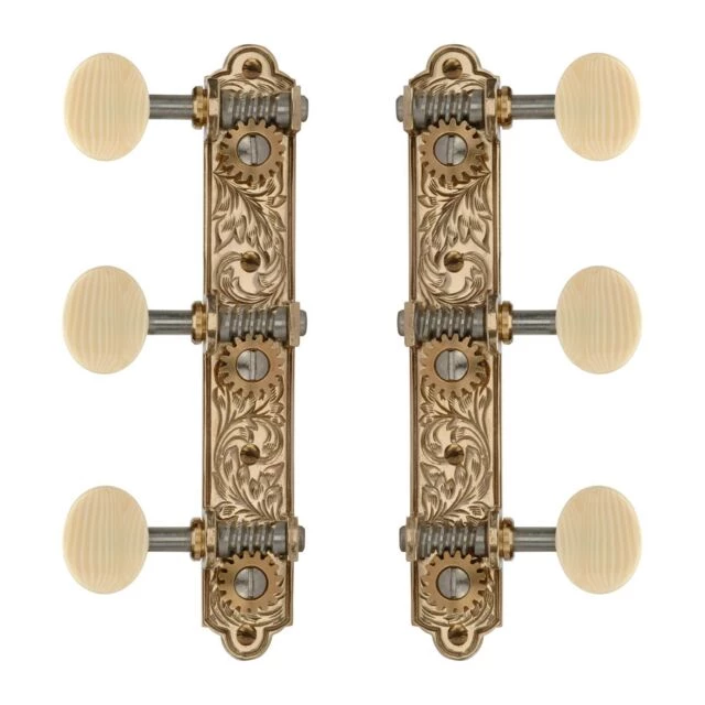 Our precision plate-style 16:1 machines feature the same gears and patented threaded worm bushings found on all Waverly guitar machines, for maximum tuning accuracy. 1/4″-diameter brass string shafts with 35mm/1-3/8″ spacing are mounted on cast polished bronze baseplates. These artistically engraved plates age to a handsome patina. Slotted, round-head mounting screws included.
